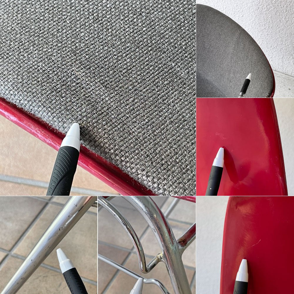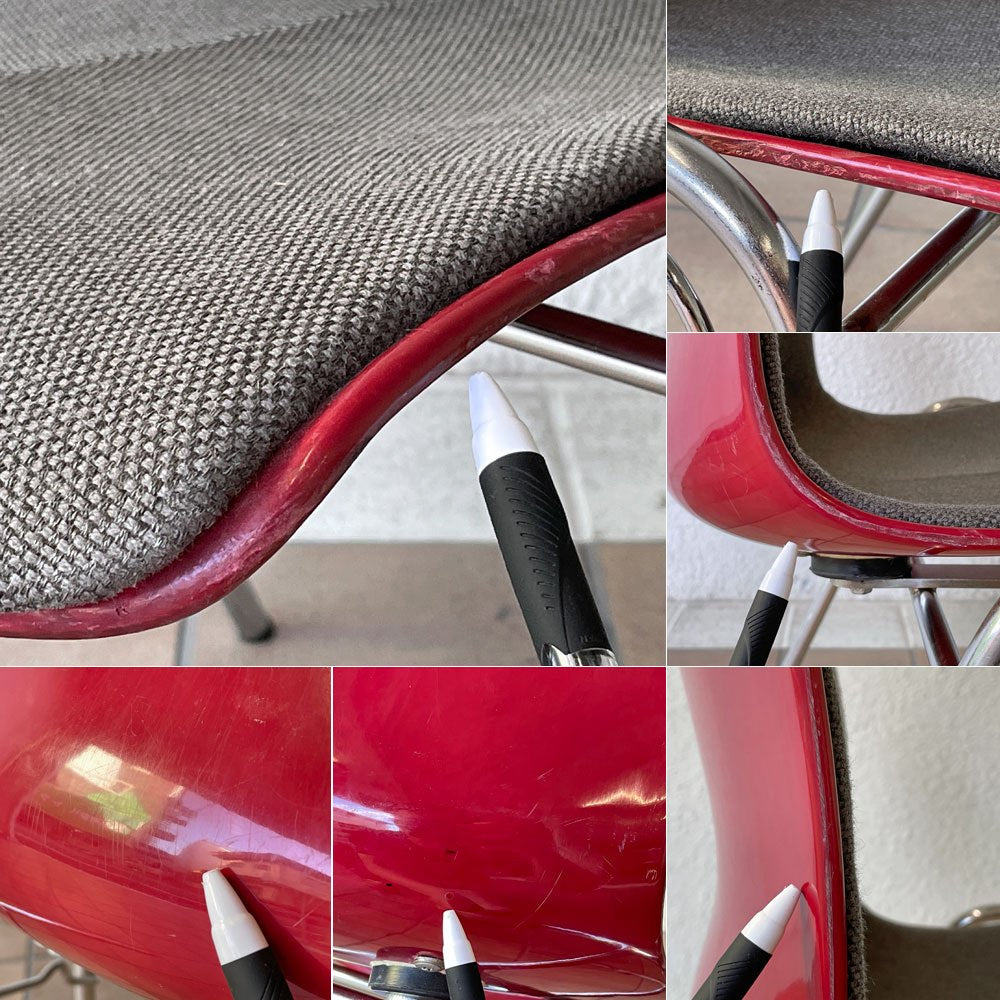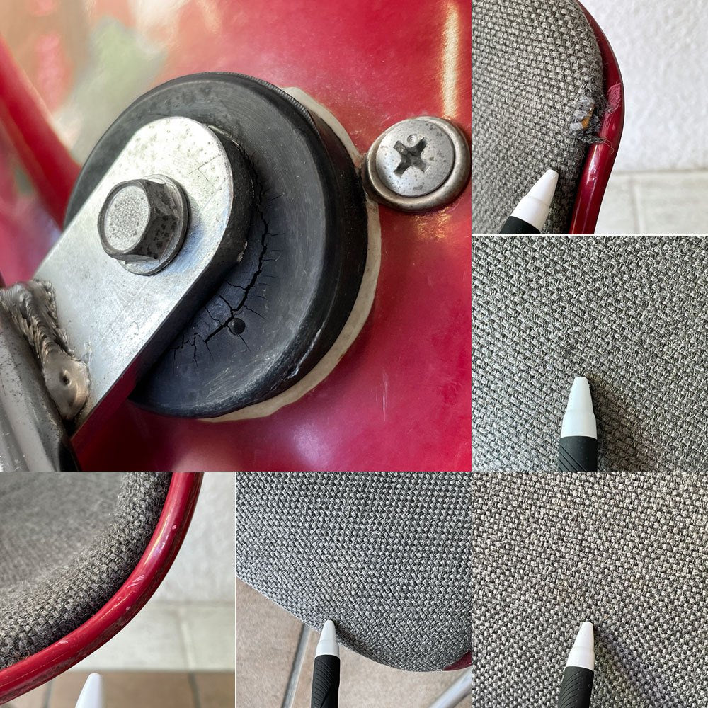 こちらはビンテージ品となります。 細かな擦れ傷や打痕、スクラッチなどがシェル全体に見られ、座面には毛羽立ちや黄変、ホツレによる穴などがございます。また、脚部にはくすみやサビ、メッキの剥がれ、グライズの削れ等が見られます。 シェルと脚部を繋ぐゴムマウントには経年による硬化・ひび割れがございますが、現状着座に問題はございません。また、脚部には歪みがあるものの、ガタツキ等は無く今後も安心してご使用頂けるコンディションを保っております。