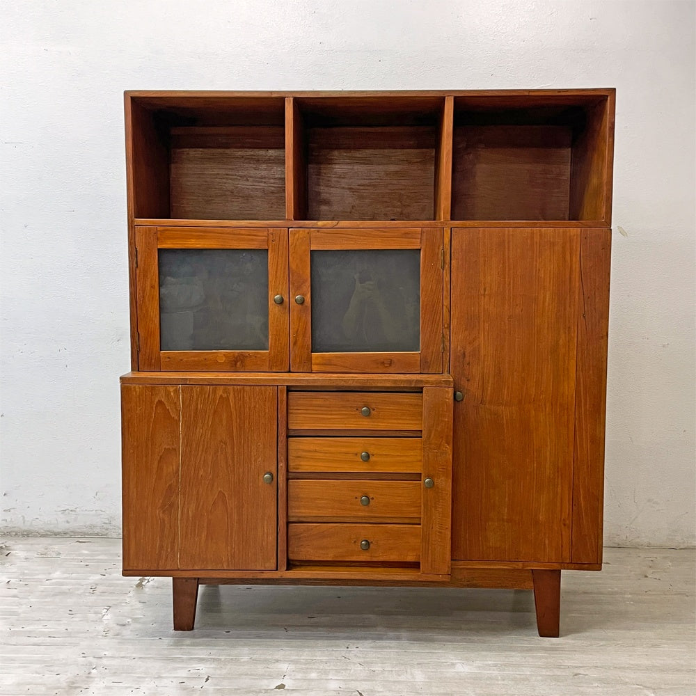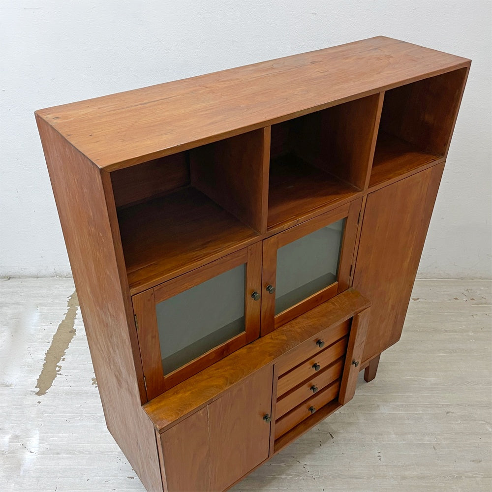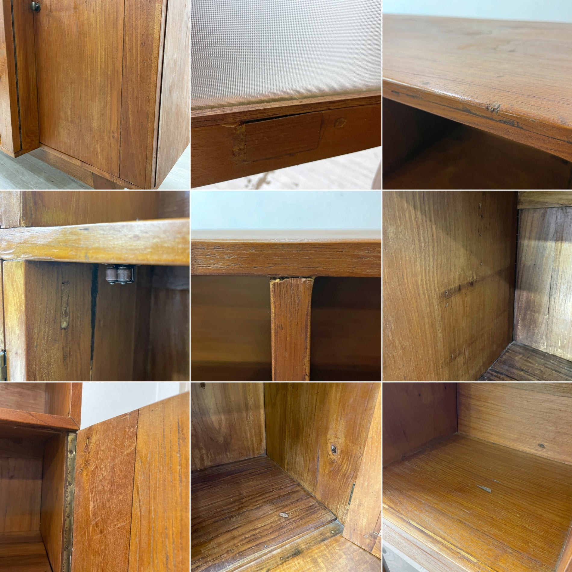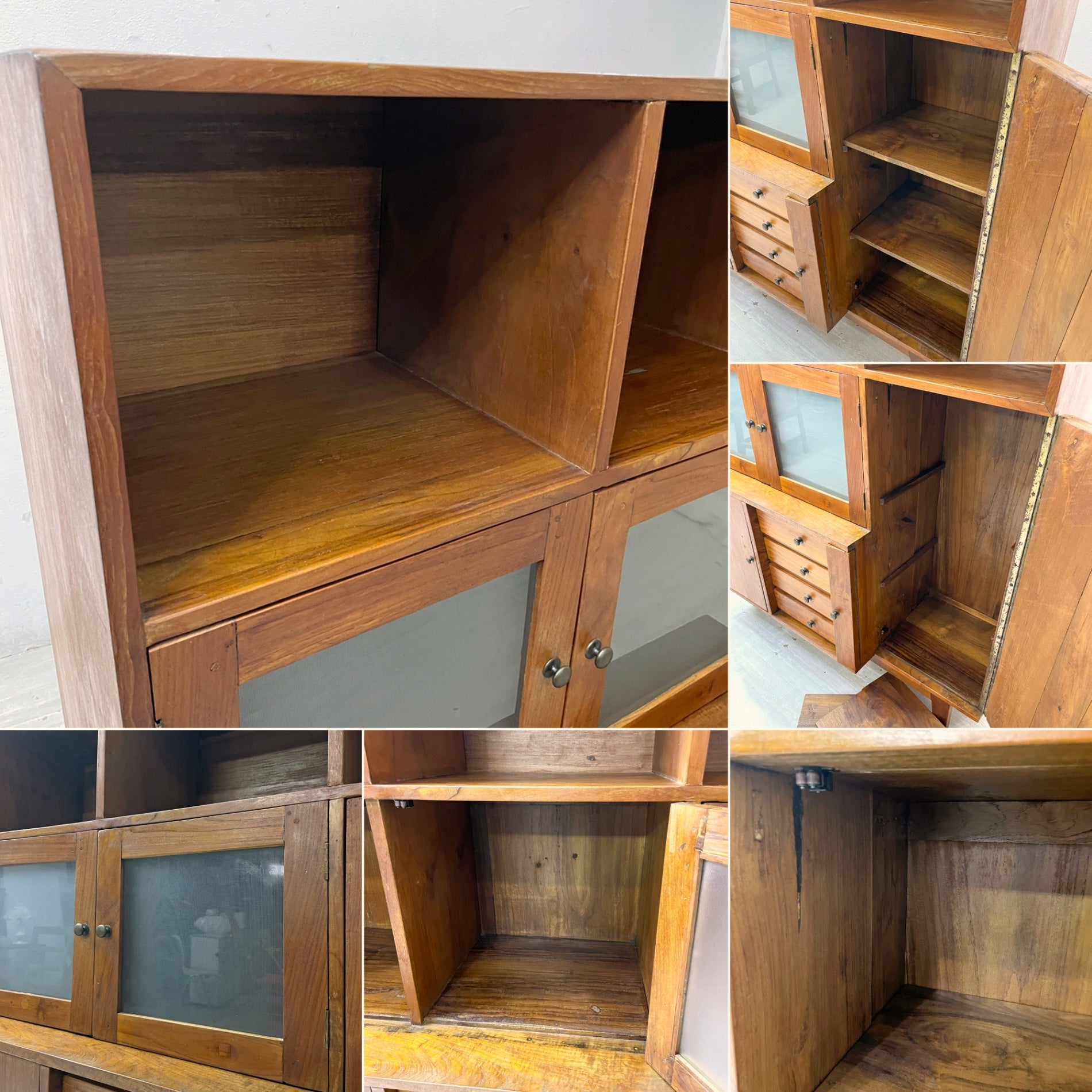 アジアン チーク無垢材 キャビネット ガラス扉 引き出し4杯 飾り棚 本棚 立ち脚家具 ●