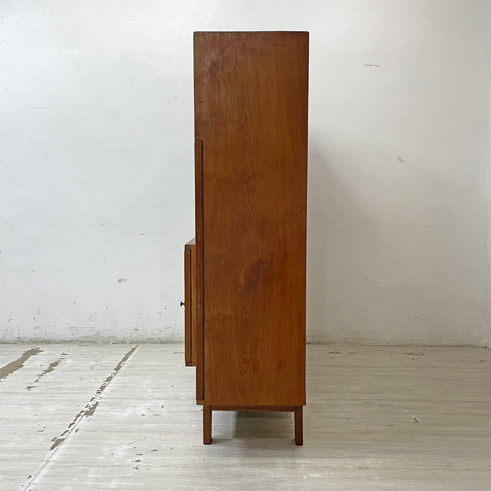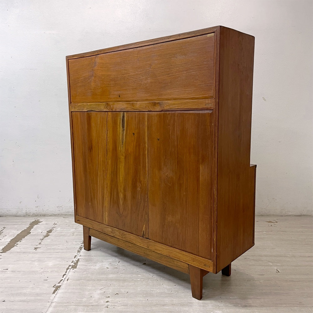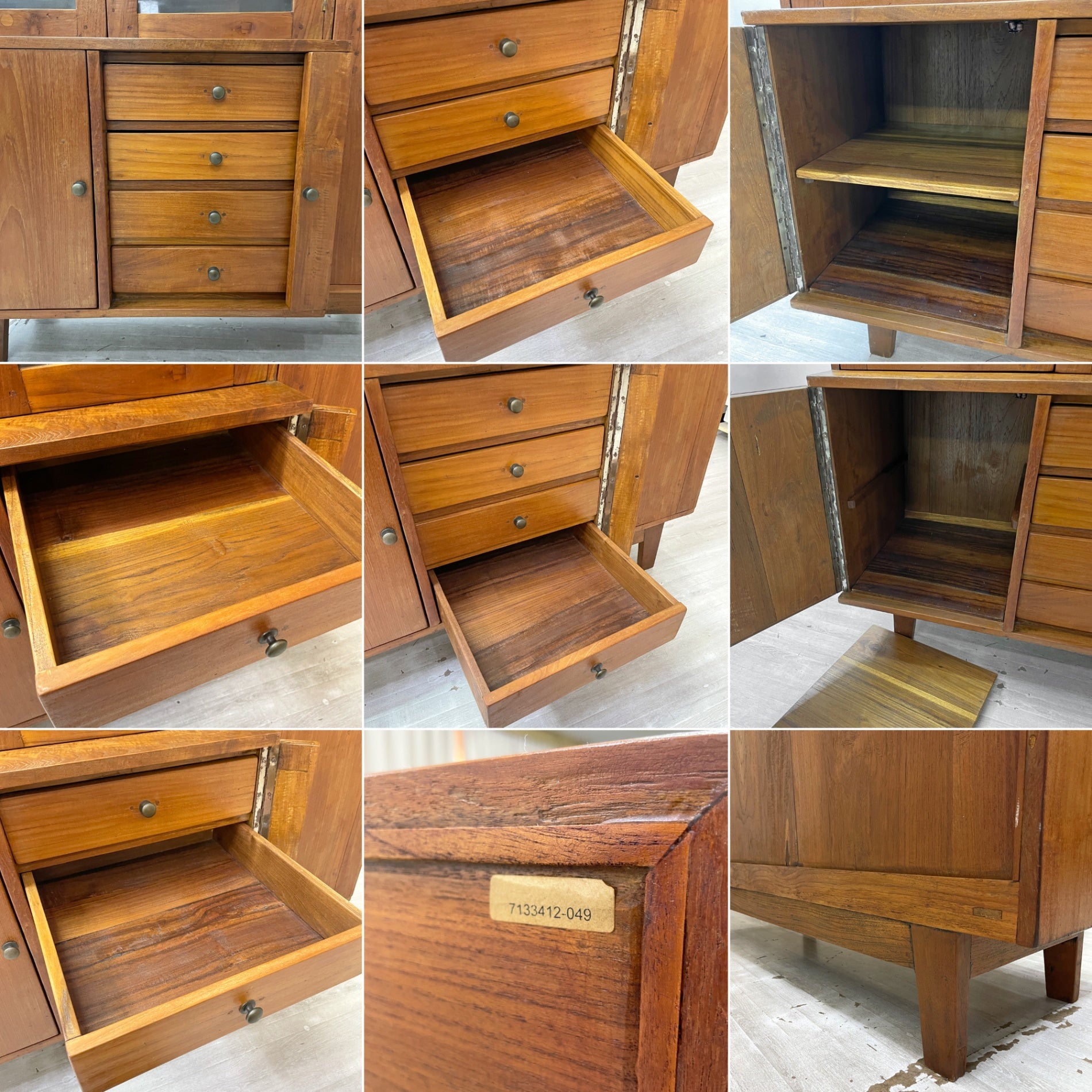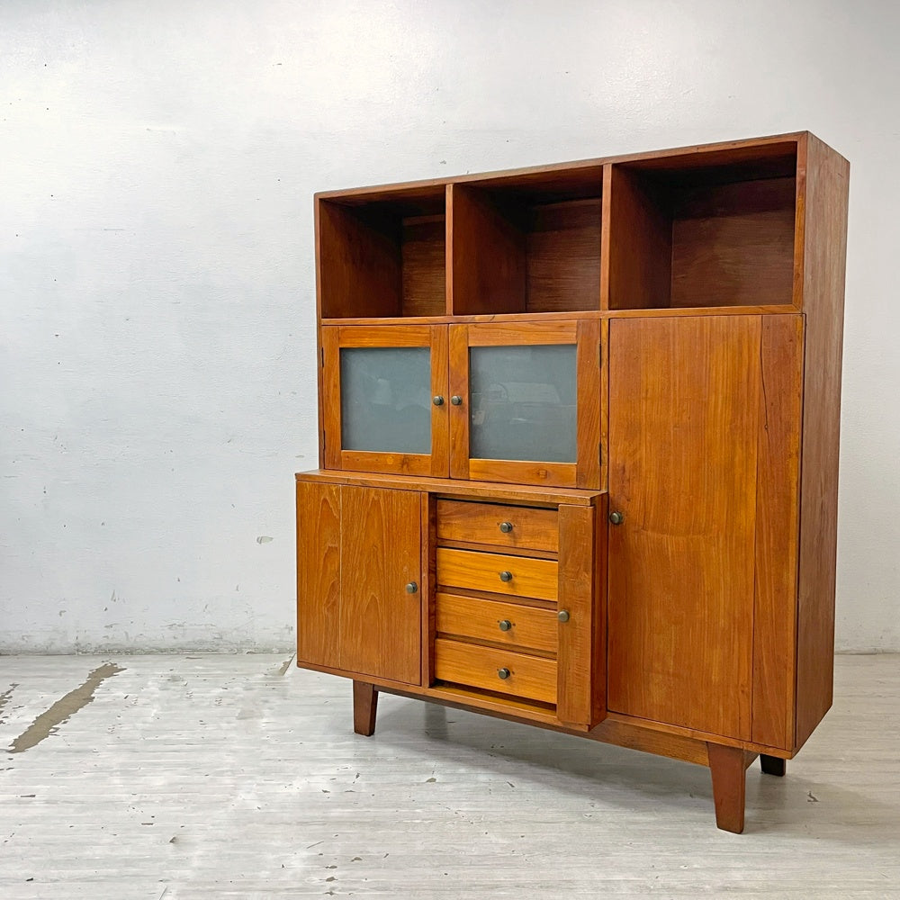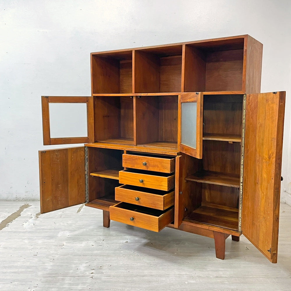 アジアン チーク無垢材 キャビネット ガラス扉 引き出し4杯 飾り棚 本棚 立ち脚家具 ●