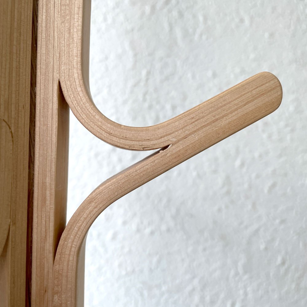 フック部分に至るまでプライウッドで造形された拘りのデザインは、お使いの空間に心地よく馴染みながら洗練されたアクセントを添えてくれます。