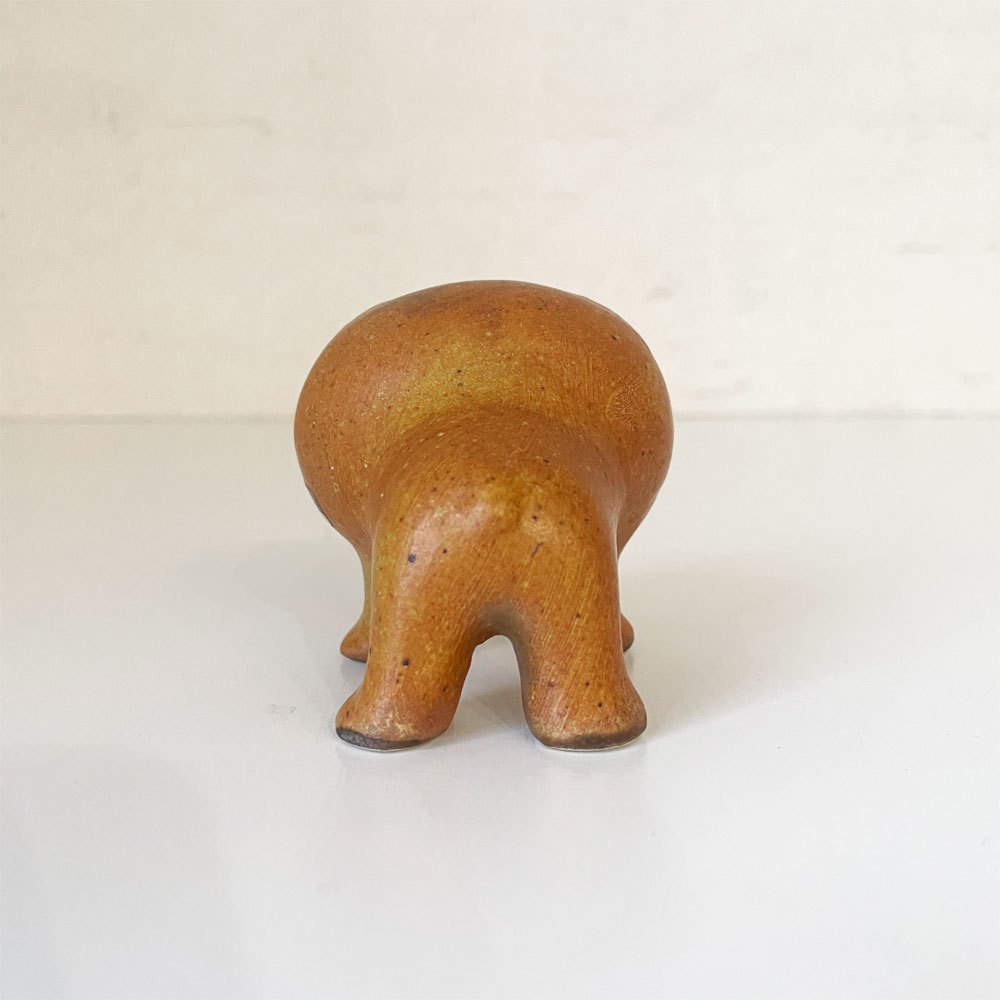茶褐色のボディと手のひらに収まるサイズ感、泣くのを我慢しているようなつぶらな瞳にへの字の口がチャーミングな1体。丸くぽってりとしたシルエットや4本脚でどっしりと佇む姿は小さくなっても存在感抜群です。