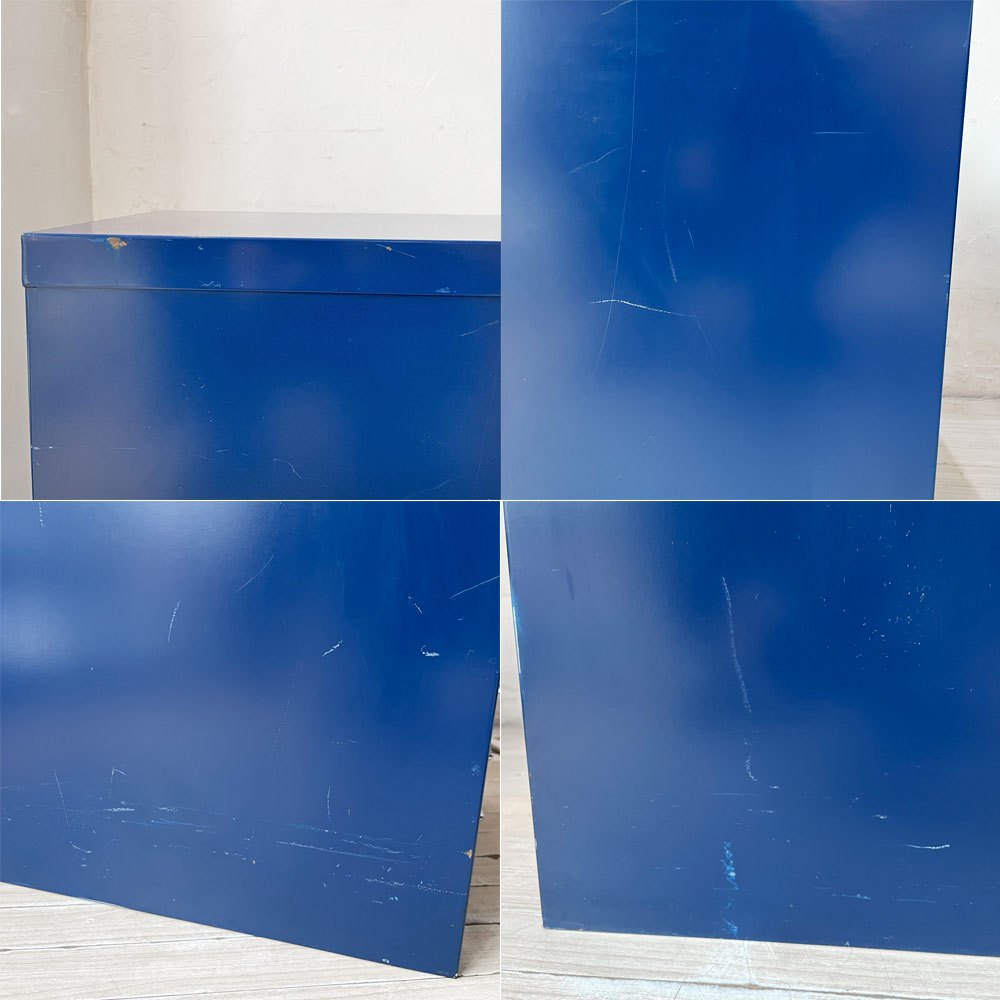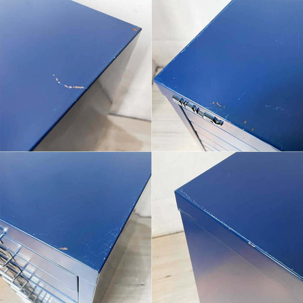 使用に伴い、抽斗内部を含む全体に傷や打痕、擦れ、塗装の剥がれ、抽斗の把手部分には金属特有のくすみや錆びなどが見られます。その他抽斗の開閉などご使用に問題となるような大きなダメージはなく、今後も実用いただけるコンディションを保っております。
