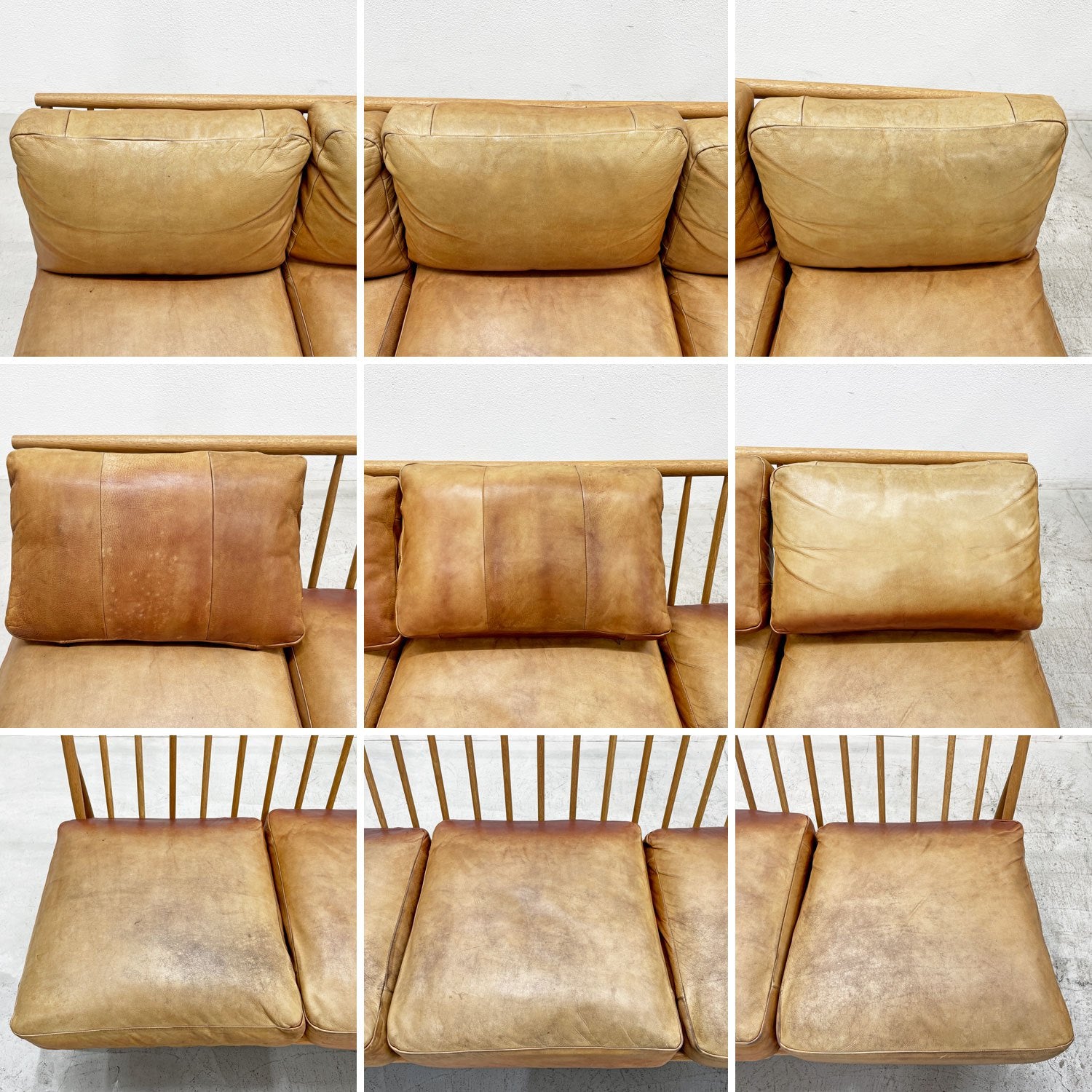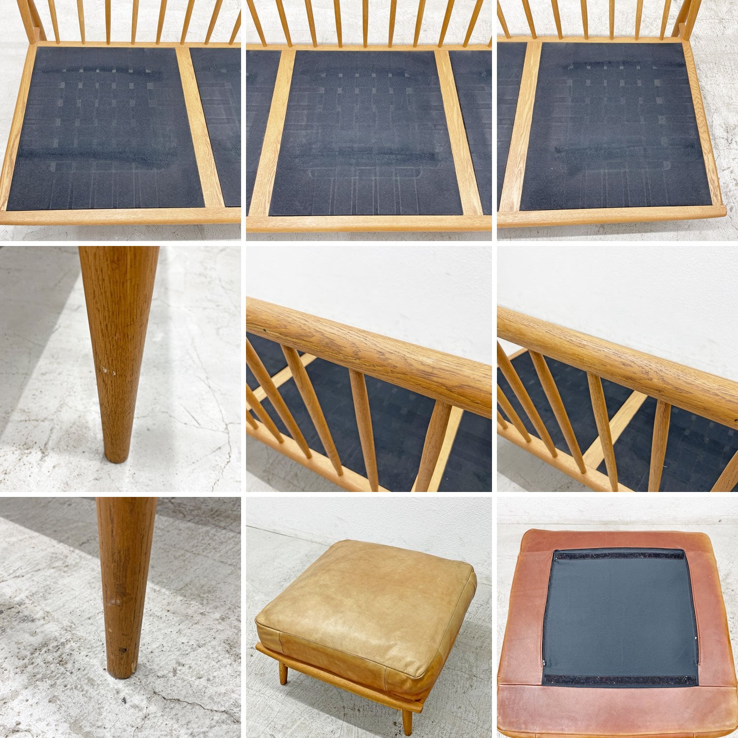 使用に伴い、全体的なレザー日焼けによる色ムラ、染み汚れ、線傷や擦れによる色ムラ、フレームに擦れや線傷、打痕や僅かな欠け、クッションのマジックテープに取り切れない汚れ、マジックテープによる座面下の毛羽立ちが見受けられます。