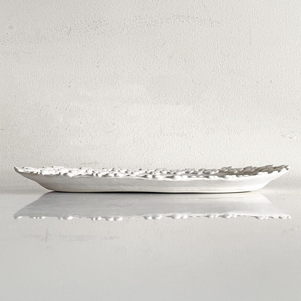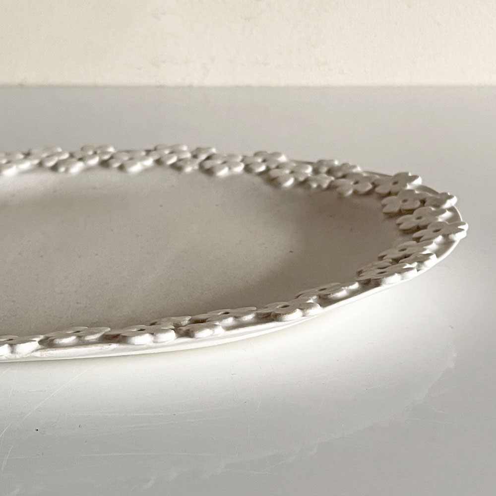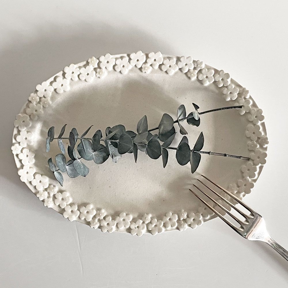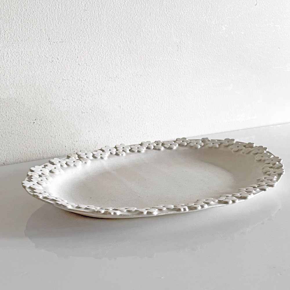 智工房 佐野智子 小花の楕円プレート オーバル皿 ホワイト系 平皿 陶器 半磁器 約23cm 現代作家 ■